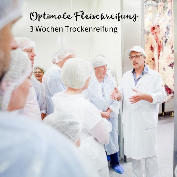 Um die volle Fleischqualität zu bekommen, lassen wir das Fleisch 3 Wochen lang trocken am Knochen reifen. Diese Zeit braucht das Fleisch, damit das nussige-umami Aroma sich gut entwickeln kann.