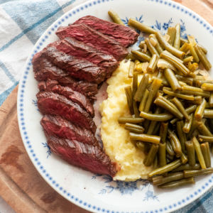 Onglet vom Weiderind mit Bohnen und Kartoffelpüree