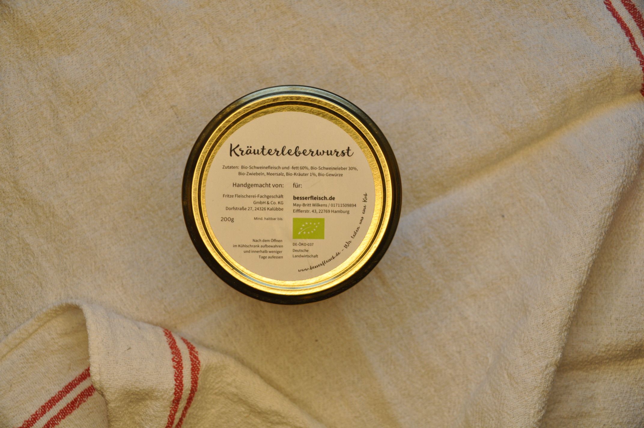 Das Fleisch und die Leber stammt von Bio-Freilandschweinen vom Hof Hansen (365 Tage draußen). Hergestellt wurde die Kräuterleberwurst von unserem Schlachter Fritze.